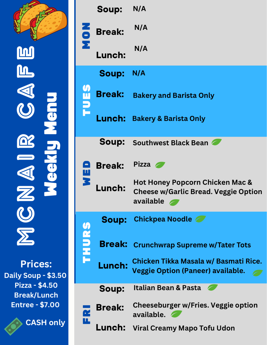 We will be having a McNair Rainbow Café in Mr. Lee's room, #117, during lunch this Wednesday, January 7th. Come enjoy snacks and set New Years goals in a queer-safe space. LGBTQ+ students and allies are welcome.